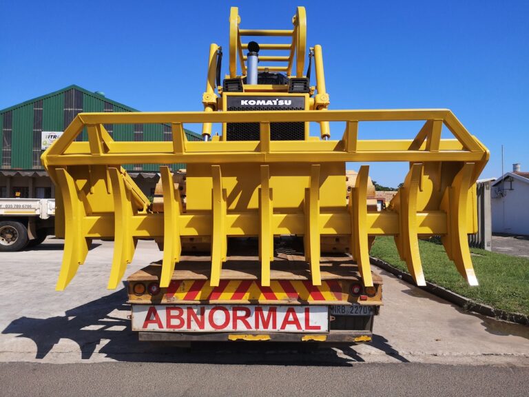 A Komatsu dozer fitted with a custom rake attachment for enhanced land clearing.