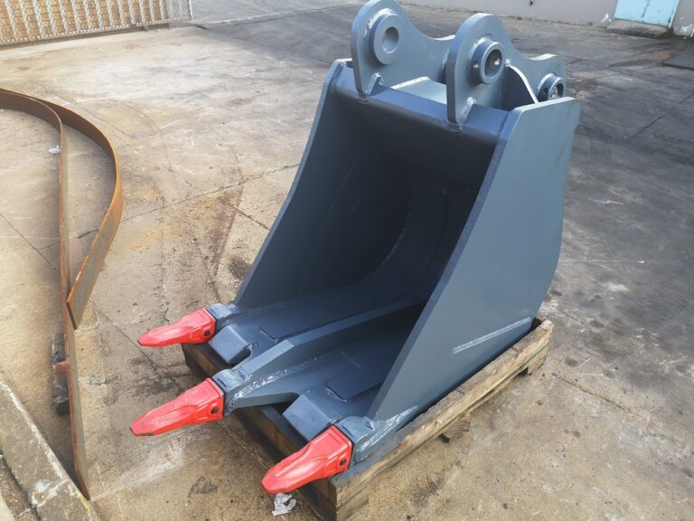 A custom excavator spade lip bucket for efficient trenching and material cutting.