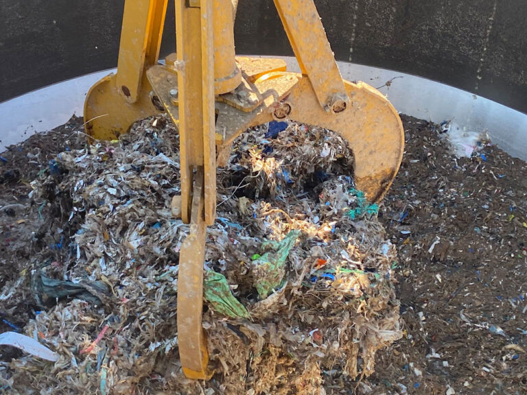 A custom arm pulp grab for secure handling and loading of pulp and fibrous materials.