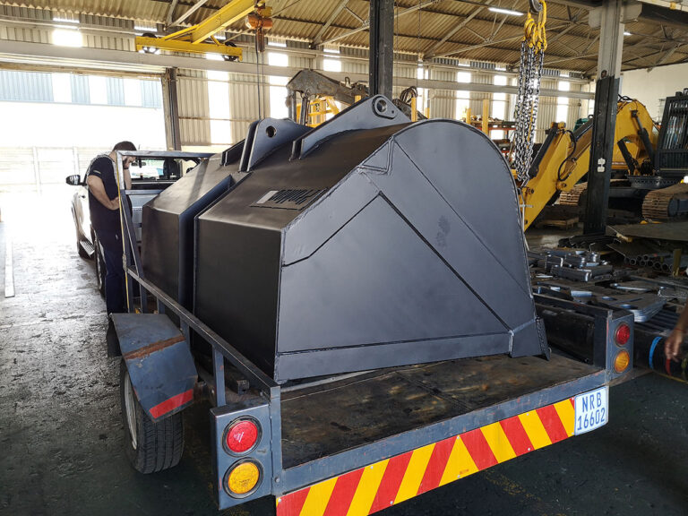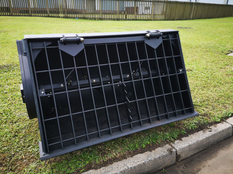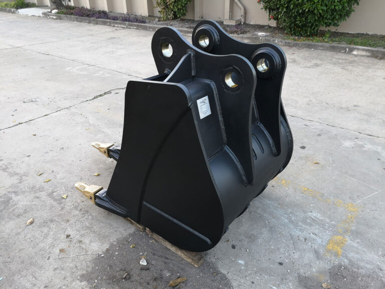 A hydraulic cement mixer bucket for easy on-site mixing, allowing operators to scoop.