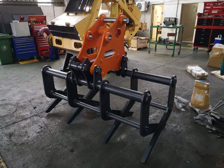 A custom excavator crane crab attachment for precise lifting and material handling.