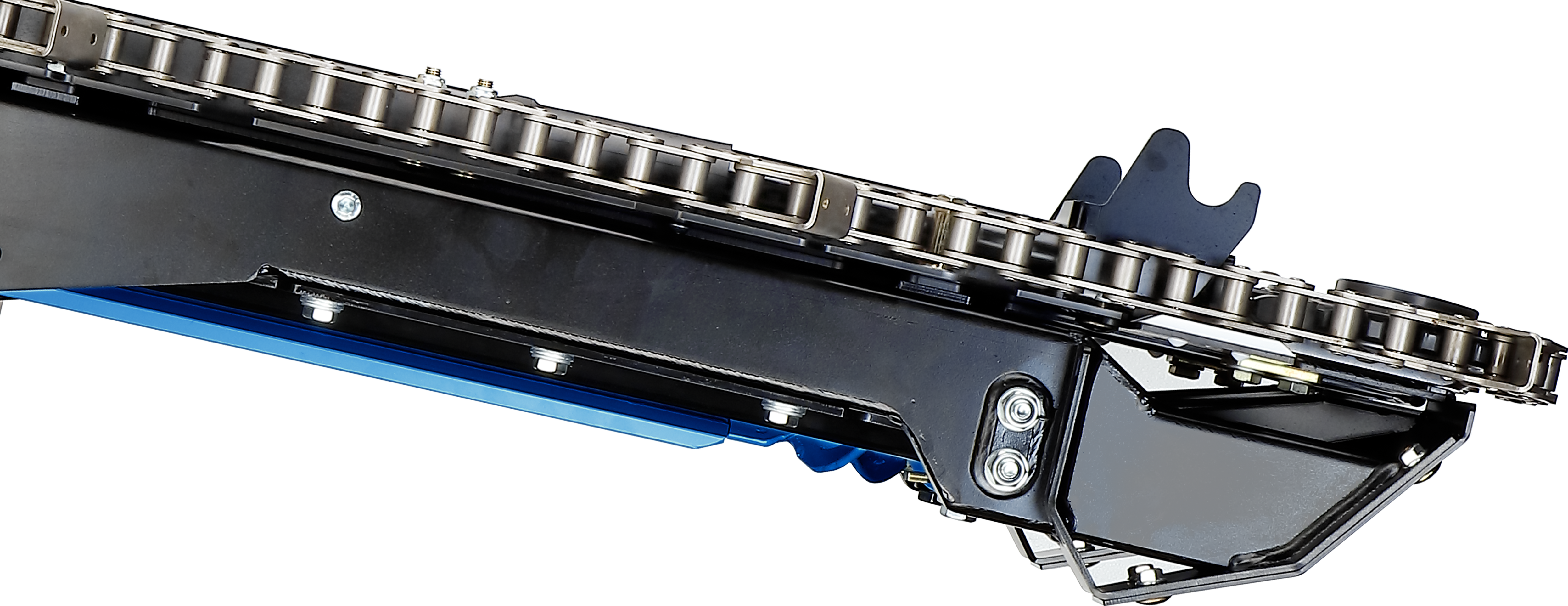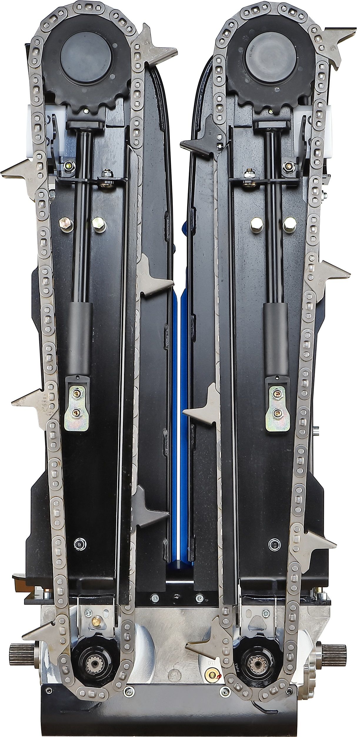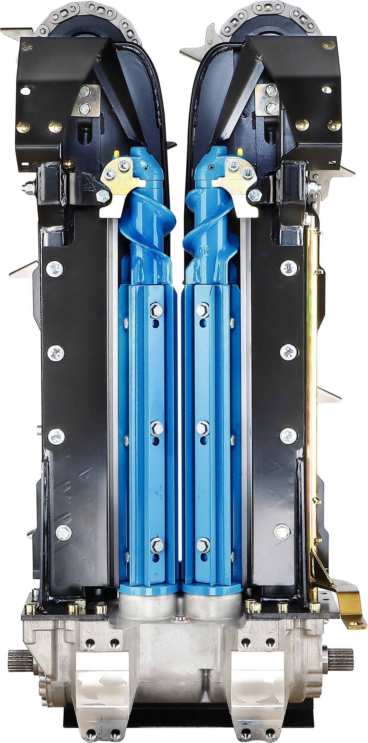 Two counter-rotating snapping rolls, each fitted with four knife bars, aggressively pull the corn stalks downward in a controlled motion.